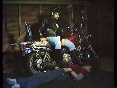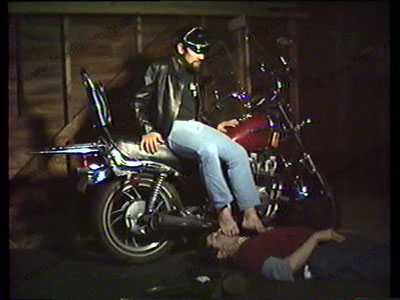 Barry drives cycle into garage to meet with admirer there who has to lick his boots, smell socks & lick sweaty toes while Barry sits on his bike!