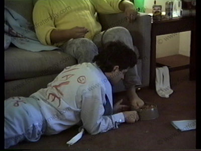 After 15 years of humiliating his college roommate, Stosh continues to degrade him by making him wear a dog collar, eat dog food from his sweaty feet, reads a degrading confession that he wrote. Stosh writes degrading things all over his tux. Much humiliation! Foot worship & service of Stosh's black penny loafers, white sox & bare feet!