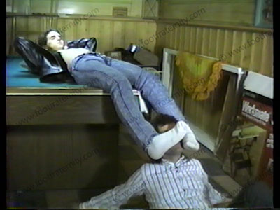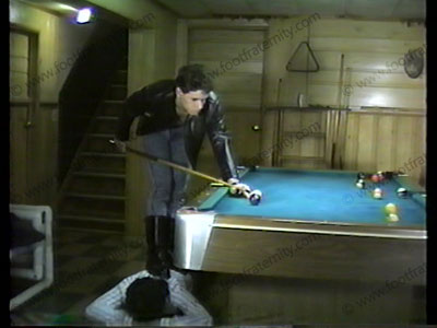 In black leather jacket, vest, boots, cap, he plays pool then lays on the table to have his black boots with vibram soles licked & worshiped. His white sox are sniffed & cleaned & he stands on his slave as he plays pool.