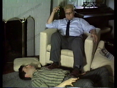 Arrogant Stosh home in his suit, weejuns & argyles & makes his servant lick shoes, smell socks & lick, kiss bare feet. Foot to crotch contact. Demeaning commands.