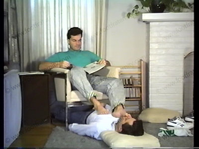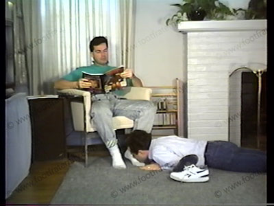 In jeans, Reeboks, sweaty white sox, he sits with slave under the chair & gives many orders for future time. Slave licks sneakers, smells socks & cleans them & licks bare feet & toes. Brad reads pages of orders & rubs his feet in slave’s crotch & face, bringing him off under the sweaty feet! Walks on the slave.