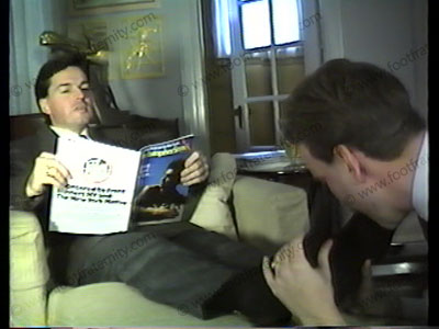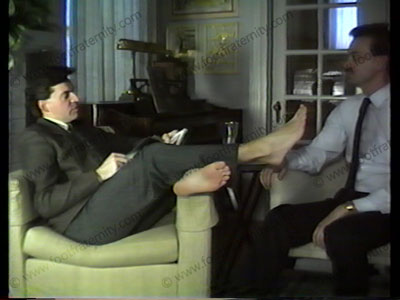 Brad in a suit, realized his business partner is eyeing his shoes & feet, he invites him to worship them. Camera from all angles, Brad pushes his bare foot into the partner’s crotch.
