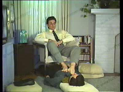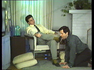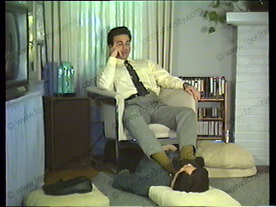 In shirt/tie, dress slacks, loafers & print socks, he give orders as to how to serve him. Slave must lick the shoes, smell the socks & lick & worship the barefeet of this young exec. Beggin. He wipes his feet on the face of his human foot mat. Verbalization.