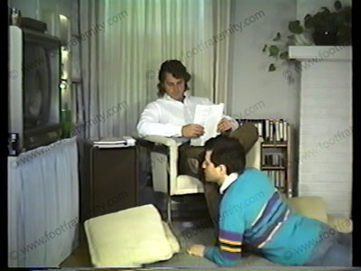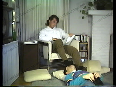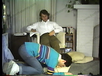 Casual outfit, smelly black sox & loafers, Jack gives orders to the slave. Very verbal, as the slave licks the loafers, smells socks & licks the bare feet & toes. Jack reads pages of orders. Jack rubs his feet in slave's face & chest. Has slave call him "god" & do a litany of his servitude to him.
