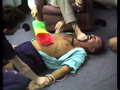 Todd gets into tickling. His buddies hold the slave down as he tickles the slave using his hands, feet, riding crop & feather duster on his stomach, arms, & feet!. Todd has another slave work on his foot as he tickles the other one. Amused at the control he has over this slave just by tickling!