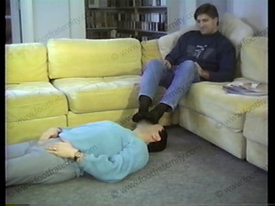 In jeans, designer sweat shirt, Bally loafers & black sheer sox (cap toe & heel), gets complete foot service - shoes kissed, licked, socks smelled & kissed, bare feet adored with close ups.