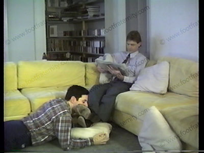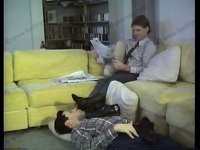 In shirt, tie, sheer sox, & wing tips, he has shoes licked, smelled, removed, sox smelled & licked. Barefoot action. His boyish looks are hot.