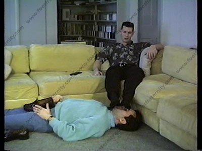 After foot worship to shoes, socks & barefeet, Gino takes off pants & shirt is in underwear for more foot action at his command!