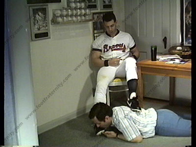 In uniform, he comes to the business manager to discuss the contract. He finds incriminating photos & blackmales him. Makes him a foot slave. Licking cleats, smelling the thin white baseball socks just after a game, then barefeet service. Great dialogue & humiliation!