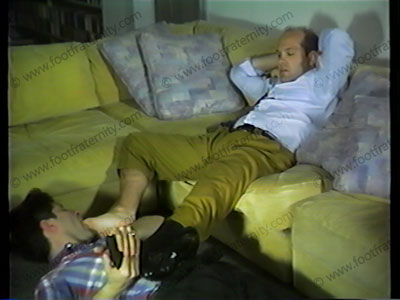 He has his loafers licked clean, his sweaty socks smelled & licked & bare feet serviced. A hot guy with thinning hair who loves to control his servant. Meaty & sweaty feet.