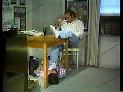 Long hair in a pony tail, Jack sits on table dangling his socked feet & bare feet in his slaves face, giving orders of foot worship & forcing the slave to complete service to his feet, sox & black boots.