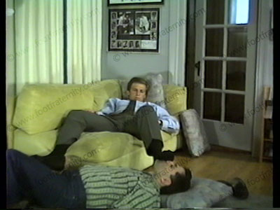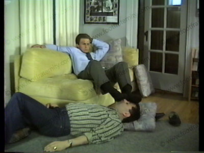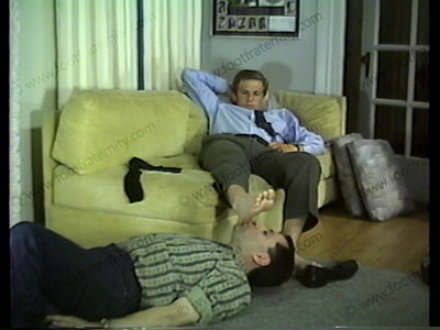 Shane (in a tie/dress clothes) has slave do his shoes & socks & do barefoot worship of these size 12's. He watches & gives orders for the slave to lick between the toes & clean the sweaty feet! Much barefoot action. Then more sock sniffing.