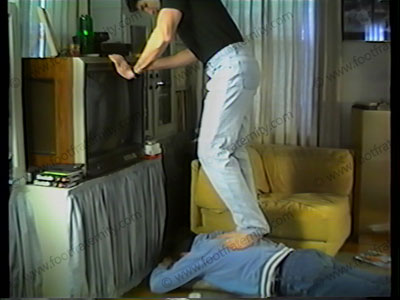 Jeans, pull over, sneakers & sweaty white sox, he has slave kneel at his feet, makes him clean sneakers, smell & lick sox & barefoot worship! Wipes smelly socked feet on the face. Verbalization & domination then he walks on the slave!