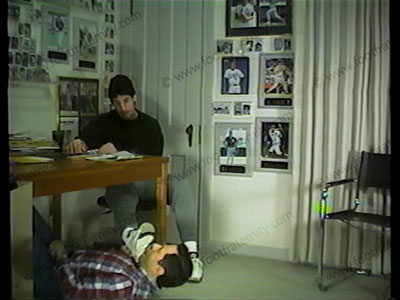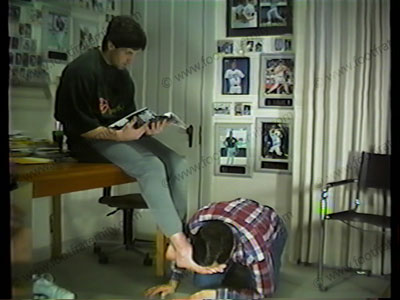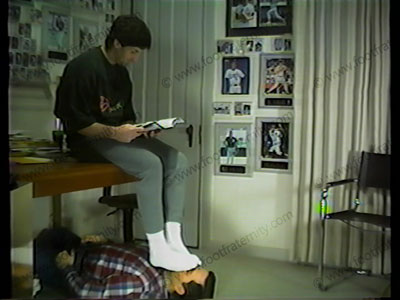 In sweats, he has slave lick sneakers, smell & worship white sox & dangles toes in the mouth of the slave. Not much talk.