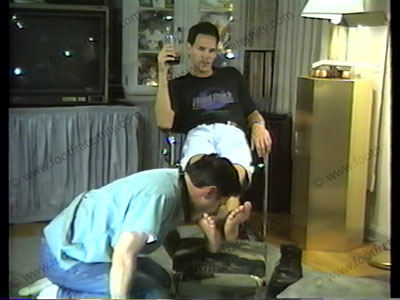 His slave on a leash worships his rugged shoes, athletic sox & sweat soaked feet. Cocky, arrogant master calls a friend to talk about the collared servant who is totally humiliated. Non stop verbalization.