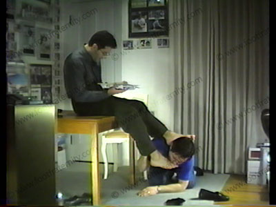 In his tie, dark shirt, patterned dark dress sox & loafers, Lexx has his lover make love to his socked feet then bare feet. Lexx rubs them hard all over the face of his lover. Toes sucked & feet licked clean of the day's sweat.