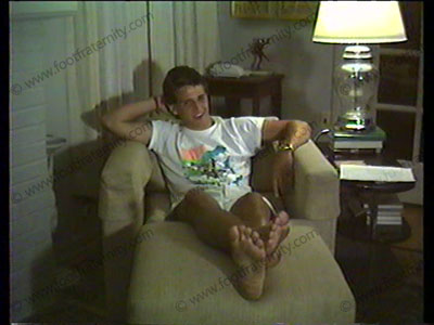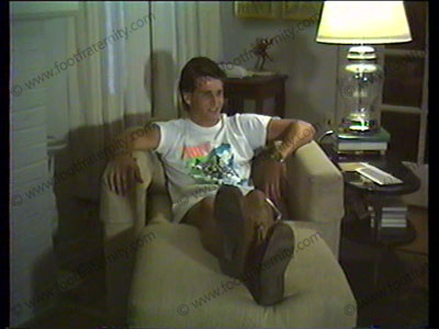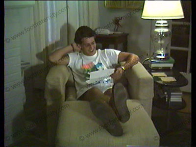 In t-shirt & shorts he answers admirer's letter. Boat shoes, bare soles. Young hockey player talks & teases!