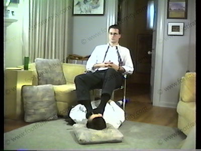 In t-shirt. dark slacks, open tie, he blackmails slave to worship boots, socks, bare feet. Verbal abuse, butt paddling by prep stud.