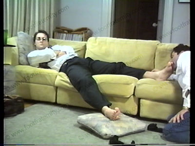 Buddy eats meal off Ty's sweaty feet. Steamy sox, bare feet, white shirt, dark slacks!