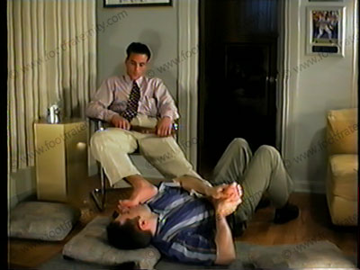 Scene with humiliation, complete foot, designer socks, & penny loafer service to very dominant well dressed Clay. He "puts down" his sissy slave & uses his belt & walks on him.