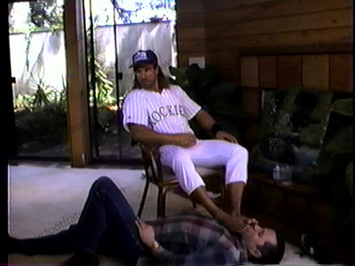 Baseball player Chase responds to a letter from Frat member, while slave works on his thin white sox & stirrups then barefeet. Spitting, verbal abuse, clips his toe nails in slave's mouth. Close ups and domination & humiliation.