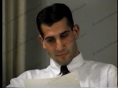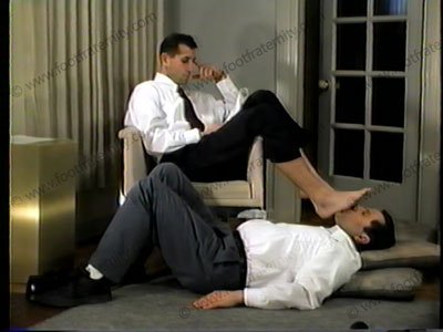 Business Exec., in dress shirt, tie, black slacks, gold toe socks & lace up dress shoes get foot & footgear service. Much shoe, sock, foot action on this arrogant type guy.