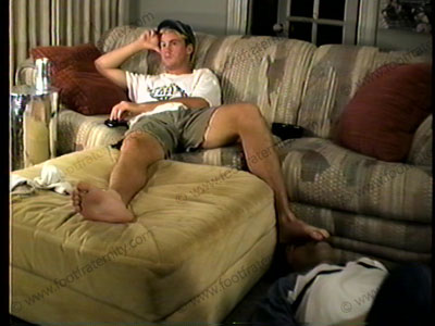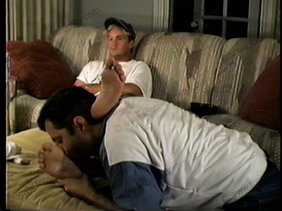 In baseball cap, white T-shirt, shorts, sneakers and sweat socks, Hale watches straight films while slave takes care of his footwear, socks and feet. Hot feet close ups!