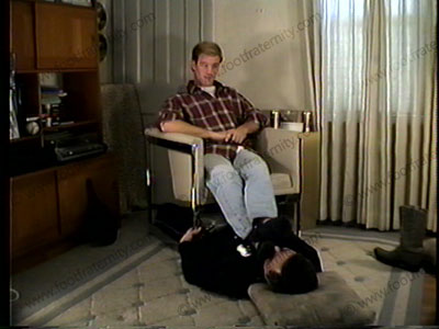 Hale, in checked shirt, jeans, blue sox and cowboy boots, he gets his feet served and worked on with solid humiliating commands to this cop who threw him out of a college football game. Total humiliation.