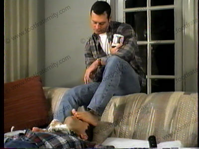 Jack comes down in the morning to find his older brother tied to a bed. He gets him back for being mean to him as a kid by shoving his sweaty white socked feet into his face & bare feet gets licked & kissed as Jack taunts & teases his brother who is strapped spread eagled. (Then he blackmails him.)