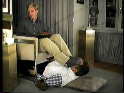 Hale, in Khaki slacks, dress shirt, Bass saddle shoes & brown sox, reads suggestions from his classmates to humiliate & embarrass the teacher under his feet to pay for being a prick in class. Teacher is humbled, gets written on with marker & eats food off of Hales sweaty feet.