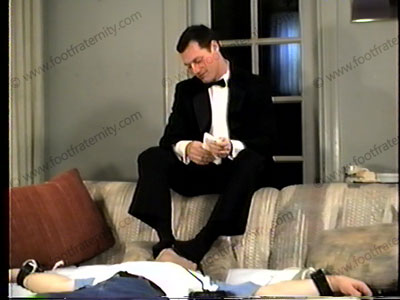 In tuxedo, Bally lace up dress shoes & black dress socks, Jack restrains his brother & proceeds to torment him with his feet. Much sock action while older brother is threatened to marry Jack's feet.