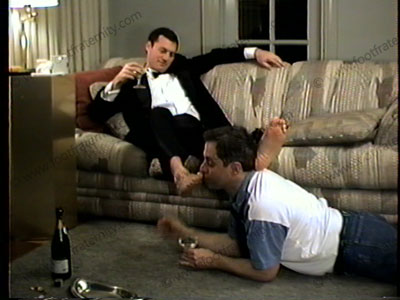 From the cover photo, in dark Bally lace up dress shoes, Jack gives domination, degradation to his sissy slave. Spits foot in slave's mouth, uses toes to push Twinkie in it. Slave has to pour champagne on his feet to cool & massage them, then lap it from his sweaty toes. He dips toes in glass for slave to slurp it up, then he writes on slave's face & undresses from tux. Erotic!