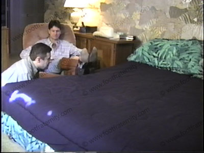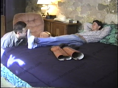As he lays back on the bed, Grant playfully has boot licking done on his very tall cowboy boots, then white sox, then barefoot as he teases his buddy who has a crush on his feet & boots. Grant is teasing & enjoys the boot & foot attention!!