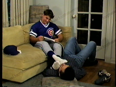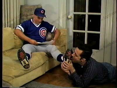 In Cubs uniform, white sox & cleats, he gets them cleaned, sock sniffing & his feet worked over & adored by foot slave. Toys with his socked foot!