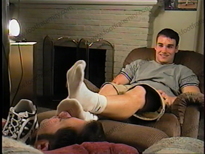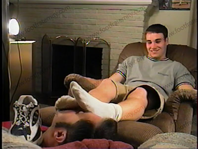In shorts, pull over shirt & sweaty white crew sport sox, he has some friendly fun at having his sox & bare feet serviced while sitting back in a lazy boy lounger & looking down, laughing. No Domination, just fun, friendly talk with a little teasing as he watches, smiles & laughs at the scene, giving it full attention. He talks about school, the Fraternity that he joined & "the guys there".
