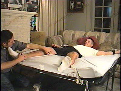 In shorts & T-shirt, sneakers & short white socks, his girl friend left him strapped spread eagle to bed.. The neighbor comes in & TICKLES Travis' socked feet then bare feet as he is helpless while strapped to the bed. He does this against his will & used a vibrator brush to tickle this straight stud. Travis yells for help & the hot stud is reduced to taking the torment. Two views of this scene.