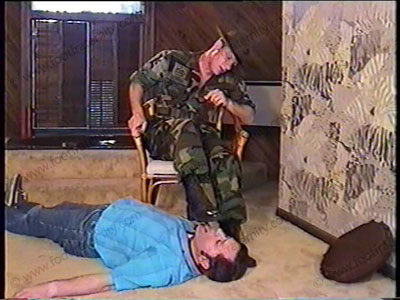 Southern Officer Sgt. Denton in full Marine fatigue uniform, has his first recruit, Ben, go through basic training at his black, jump boots & sock sniffing. He barks out the orders, commanding respect for his feet, sox & boots. Then he goes in for a shave to find Private Ben has escaped. He makes the custodian take his place at his "Boot Camp" session. Forcing him to be a boot dog, boot licker, sock sniffer & humiliate him in the basics of boot training & Sergeant's foot service of boots, sox & bare feet. Sergeant Denton barks the orders of complete boot, sock & barefoot service, & all are followed to the humiliation & domination of the two guys in this military service.
