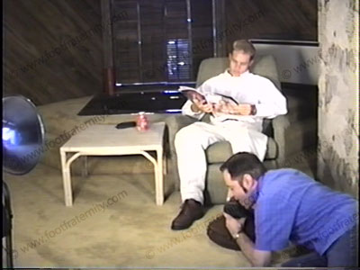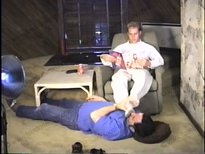 In white shirt, white summer long pants, white sweat sox, & brown LL Bean Boots, this young cocky guy has his boots removed, steps all over the face of his human foot mat while he sits back, just chillin, teasing with his young, cocky smiles & attitude! He knows we worship his feet, & he really likes it. Good foot love making to this young rich nineteen year old, blonde god. Two views (one close up) of this very hot scene! ATTITUDE.