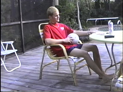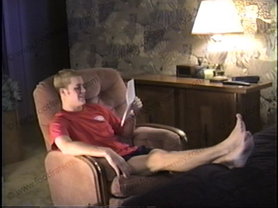 In shorts & red T - shirt, Danny reads the fantasy from a member about serving at the ego and the feet of this teenage high school jock. He reads is to his room mate, Walter, who enjoys the comments. He kicks his feet up on the bed as he laughs and reads this fantasy. He comments about the fantasy, laughing and making many teenage comments. After the fantasy is exposed, he goes out for a smoke and calls his straight buddy to tell all about this frat member's fantasy. A hot solo scene of this young blonde teen age guy who laughs and teases about the fact that we want to lick & kiss his feet. He thinks it's really funny & plays with the idea, deciding that everything has it's price, & he may be available!! His innocence, naive nature & acceptance is refreshing. He learns that frat members want to be his foot slave, & he gets used to the idea. Lots of laughter, teen age teasing, and fun with this young golden god!