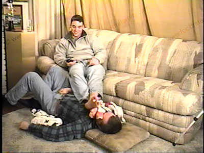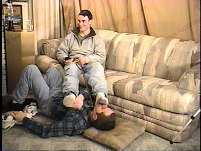 In jeans & gray wool sox & work shirt, Brent comes in with his slave dog on a leash, as he sits back to watch hot flix & he gets his New Balance sneakers licked, has his sweaty sox sniffed & rubs them in slave's face, then mostly barefoot service. He gets paid to sits back, have a slave dog rub & worship his feet as he watches hot movies. This students is liking this kind of service. A few verbal orders & commands. Mostly just foot loving. All face to foot, & sock contact.