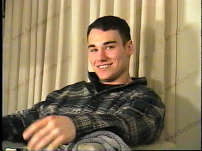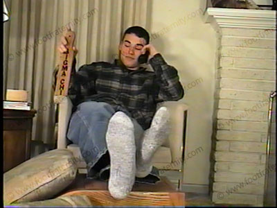 At the Sigma Chi Frat house, Brent receives a phone call from a pledge who has to be a slave at his feet! In jeans, wool sox, he answers give a hot J/O response to a pledge who must service at his feet. Watch an actual call that this teen receives as he responds to having a pledge begging to smell his sox, kiss his feet, etc. As he laughs and tells this "bitch" what to do as you watch him wiggle his toes, remove his sox, laugh into the phone as the plegde humiliates himself. He comments, teases & takes control. His remarks are very hot to listen to. This is a perfect hot J/O phone call, only you get to watch Brent on the phone with his responses & see his hot young teenage feet at he teases you with his comments & answers to a phone call. He tells the caller just what to do to his feet. Bonus scene: Afterward, he reads a letter from a Foot Frat member who loves his feet & finds Brent perfect. Watch his response to having fans!