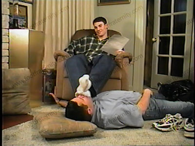 This friendly college fraternity teenage stud does the ULTIMATE in humiliating, dominating mostly friendly teasing, all verbalization of his foot "bitch." He is wearing jeans, takes off his shirt to show his hot, muscular pecs!, Adidas sneakers & sweaty sox. This very "easy-going" teen reads (out loud) the humiliating letters he wrote to his slave, then orders him to do all sorts of things for him, buy him a guitar, CD's, straight X tapes, etc., & kiss his feet begging Brent to take the gifts, as he laughs at his servant! He tells him what to do, makes him confess his love for the teenage feet, teases him with his toes, makes him lick & deep whiffs of the sweaty sox, gives orders for the future; paddles him; a totally hot of Brent's teasing, laughing at the humiliation, enjoying the power he has over someone who is older that him. The friendly boss give's tons of commands, orders & laughs at the slave's embarrassment watching everything! Barefoot service; uses his feet to move the bitch's face; used as a foot stool; wiggles toes in the face; nose between toes; licks between young toes; clips his sweaty toe nails in his mouth to make him eat them; sets his roommate up with same service to his straight feet too...and it goes on and on! Domination is a laughing manner, all with teasing & making fun of his bitch! This tape is simply too hot to tell about here. Incredibly hot video!