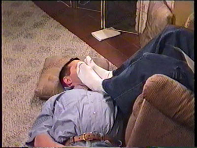 Same scene as V-611-612, except this is from camera of Close up of shoes, sox & feet in the face.
