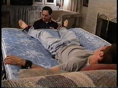 Brent is left bound by his girl friend as his neighbor comes in & discovers his vulnerability. The guy proceeds to tickle & torment Brent's young, strong meaty socked & bare feet. Ticking includes a vibrating brush, feather, fingers, etc. See this strong, macho guy reduced to much laughter & tickle torture while bound! Two great angles of this scene on this tape.