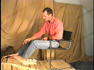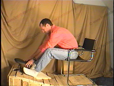 With his slave locked in a specially built box with only his face available through a hole in the top, Jack teases & torments the slave’s face as he cannot move & must take whatever Jack dishes out. Then Jack answers some Fraternity questions read to him by another Frat member who is in the room. This special "Jail" box was specially built to encase the slave with only his face sticking through the base. Jack walks & sits on top of the slave’s new confinement box with his feet right in the face of the slave. It’s like the slave was built into the floor with his face only available to the abuse & humiliation of his Master’s feet. He has his lace up brown boots licked, his sweaty white socks sniffed & bare feet serviced. Very humiliating & intense as slave is totally at Jack’s control. (It’s like he is locked in the old fashioned "stocks" & can’t move his face to get away from the sweaty sox & feet.) Two great views, one very close on the slave’s face as Jack give teasing answers & humiliates his slave who must do much foot service, & lots of foot licking, toe sucking & licking between the toes. Jack tells about his experiences of the past while he has the slave underfoot!