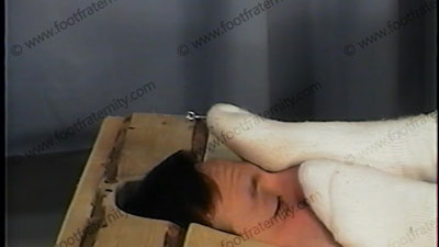 Troy teases his slave by finding him in a special restriction box with only his face available through a hole in the top. The guy’s face cannot move & must take whatever Troy dishes out. Tom comes in & asks Troy all sorts of hot questions as Troy shoves his sweaty white sox, sneakers & bare feet in the face of his slave. Troy just finished his work out, & is wearing shorts, colored T-shirt & has really sweaty feet. Much verbal talk, commands, laughing, teasing & making fun of the slave with no choice but to smell, kiss & lick this athlete’s feet. Licking between the baseball jock’s toes, swallowing the toe jam & sweat. It’s like the guy was built into the floor with his face only available for the embarrassment of his slave. Then his sweaty white socks are stuffed into the mouth followed by exclusive bare feet service. Two great views, one very close up! Much wiggling of toes. The two guys laugh & talk, command, tell stories, with much verbal domination & humiliation about what Troy will be doing to the slave.