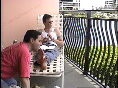 Two different views of this blonde, tattooed, 21 year old, super straight, guy (one very close up on the feet & face with a moving camera, one full view). Rusty is sitting in a lounge chair on the balcony, by the pool, reading while the other guy kissed his Timberland lace up, tan shoes, sniffs & services his sweaty white socks, then does complete barefoot service. (No talking or domination.) You only hear the background noises of people at the pool who can’t see this scene. Rusty will occasionally look down and watch with a smile, but mainly just reads his book as the guy is "making love" his feet, sox and shoes. Sock sniffing, toe sucking, nose between toes, foot licking, etc. – complete service to his young, very hot and well shaped feet. NO VERBAL OR DOMINATION) just foot/sock/shoe love. Then a hot scene at the end of Rusty sleeping in the raw, waking up, pulling on his white crew socks, pulling on his tall black boots, then getting ready to go out on the town.