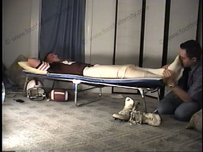 Just after the game, Travis comes to the locker room, stretches out on the cot & has a slave smell his socks & worship his feet. He has sissy slave trapped under the cot, forced to smell & serve the jock socks & feet. He takes his jersey off immediately to show off his hot macho chest. Then he removes his sweaty football pants to do the scene in just a jock strap. Makes slave sniff jock strap, serve as slave while he yells, gives out orders, makes fun of slave. Toes in nose, licking between toes & soles of his feet, slaps his slave in the face. Two views, (one close from under the cot to see the slave under Travis’ body & feet, & one from full view to see Master Travis). Then Travis flips over on the cot where is has a hole cut into it. Slave can sniff jock strap! Travis then gets hot. Then he sits over the spot. Much action & foot service!