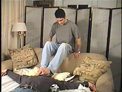 Unexpectedly, Nomar comes in to his slave’s bedroom to find him tied down to a bed. The guy was waiting for someone else to come in for fun. After a visit to the gym, Nomar is in jeans & a pull over shirt sitting above his slave & shoving his sneakers & sweaty white, socked feet into his face, He humiliates him, stepping all over the sissy’s face. Name calling. Then bare feet gets licked & kissed as Nomar taunts & teases his slave who is strapped spread eagle. Two angles of this scene, one from a close-up camera. Lots of verbal hot talk & much teasing. He enjoys the foot service & attention at his feet. Service to socks and feet & toes, then this jock sets the orders of how it will be from now on having a foot slave. He does the scene with much laughter at his slave & making fun of having this power as he is only 18 years old.