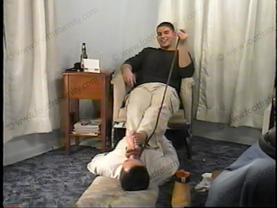 In pants, sweaty white socks & boots, JT has his slave lick his boot soles. Then he has them removed to wipe his sweaty white socks (with holes in them) in his face. This teenager is only 18. Wipes his wet & sweaty socked toes in the face. Much white sock action. Foot kissing. He tells the orders & looks at his notes as to how to tease a slave slave. Uses slave as a footstool. Embarrassing & humiliating. He comments & sets many orders for the future & laughs at the foot worship from his slave. Foot massage. Toes in nose, licking between toes, while he tells them all kinds of embarrassing things about his foot slave. This guy is a football All star jock. He ashes in his bitch’s mouth. Then he uses slave’s head as a footrest! JT laughs at him as the humiliation continues. Two angles of this scene, one from a close-up camera, one from a moving camera man. Totally humiliates & degrading words from this straight guy as he has the pleasure of being paid to have his sweaty feet & footgear worshipped & serviced. He is very cocky & arrogant. He gives orders. He takes his personal phone calls from his ladies while his feet are being serviced. Total foot/sock worship, service and adoration combined with laughter & much foul language.
